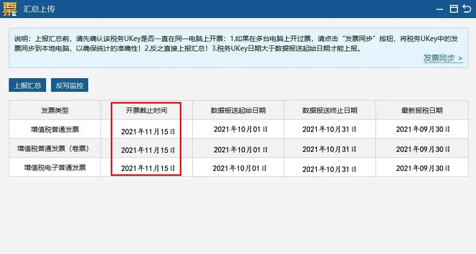 操作流程:重新打開匯總上傳界面,查看各發票類型開票截止時間是否更新到下月中旬,若更新,說明操作成功。