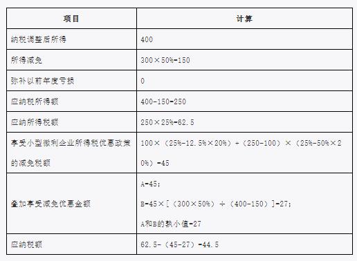 下面,以小型微利企業為例說明疊加享受減免稅優惠的計算方法。企業選擇享受其他減免所得稅優惠政策,可據此類推。